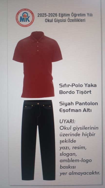 Okulumuzda 2025-2026 Eğitim Öğretim yılında mevcut kıyafetlerde herhangi bir değşiklik olmayacaktır.